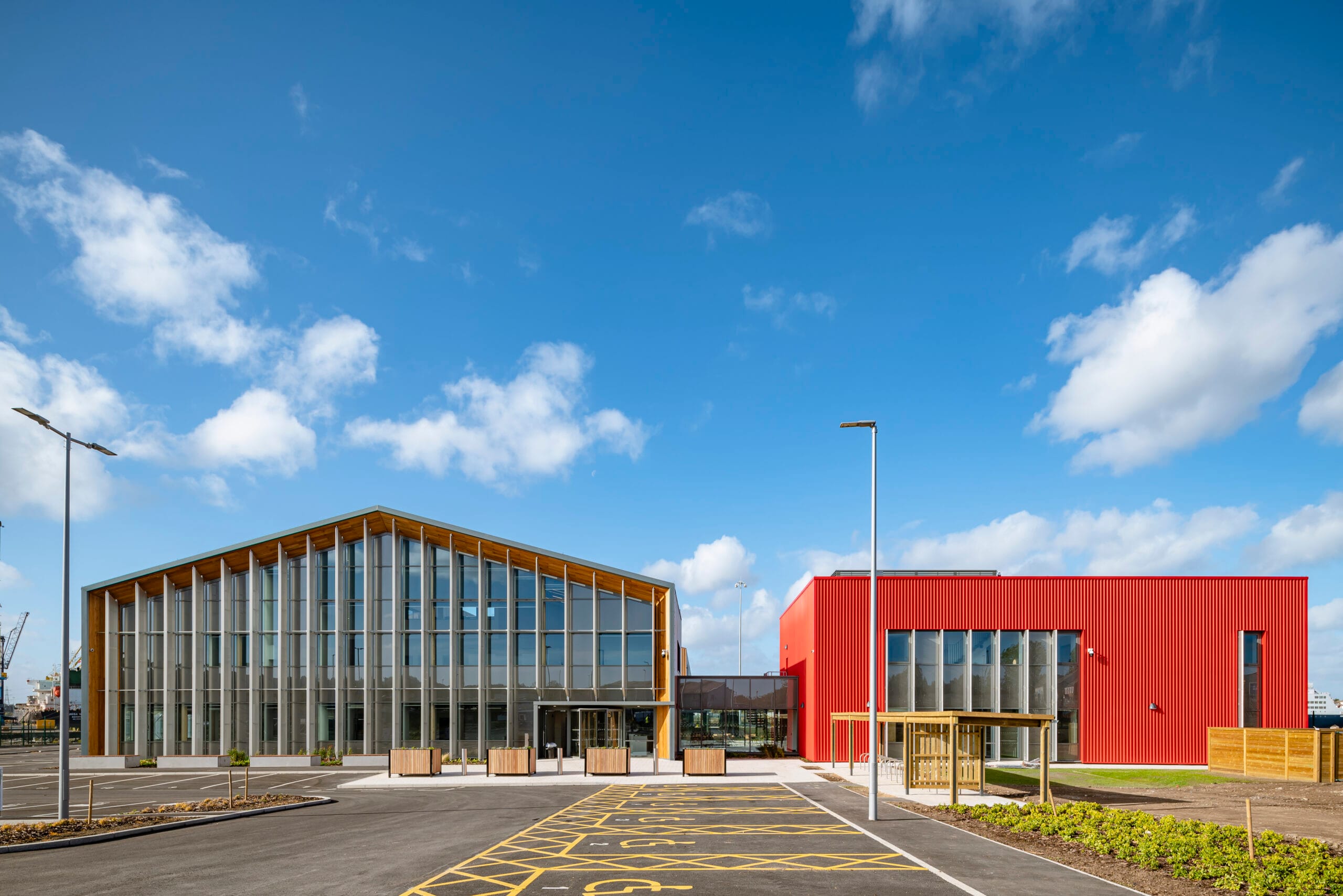 Dogger Bank Facility at Port of Tyne consists of three building elements, all of which support the Dogger Bank Wind Farm in the North Sea.