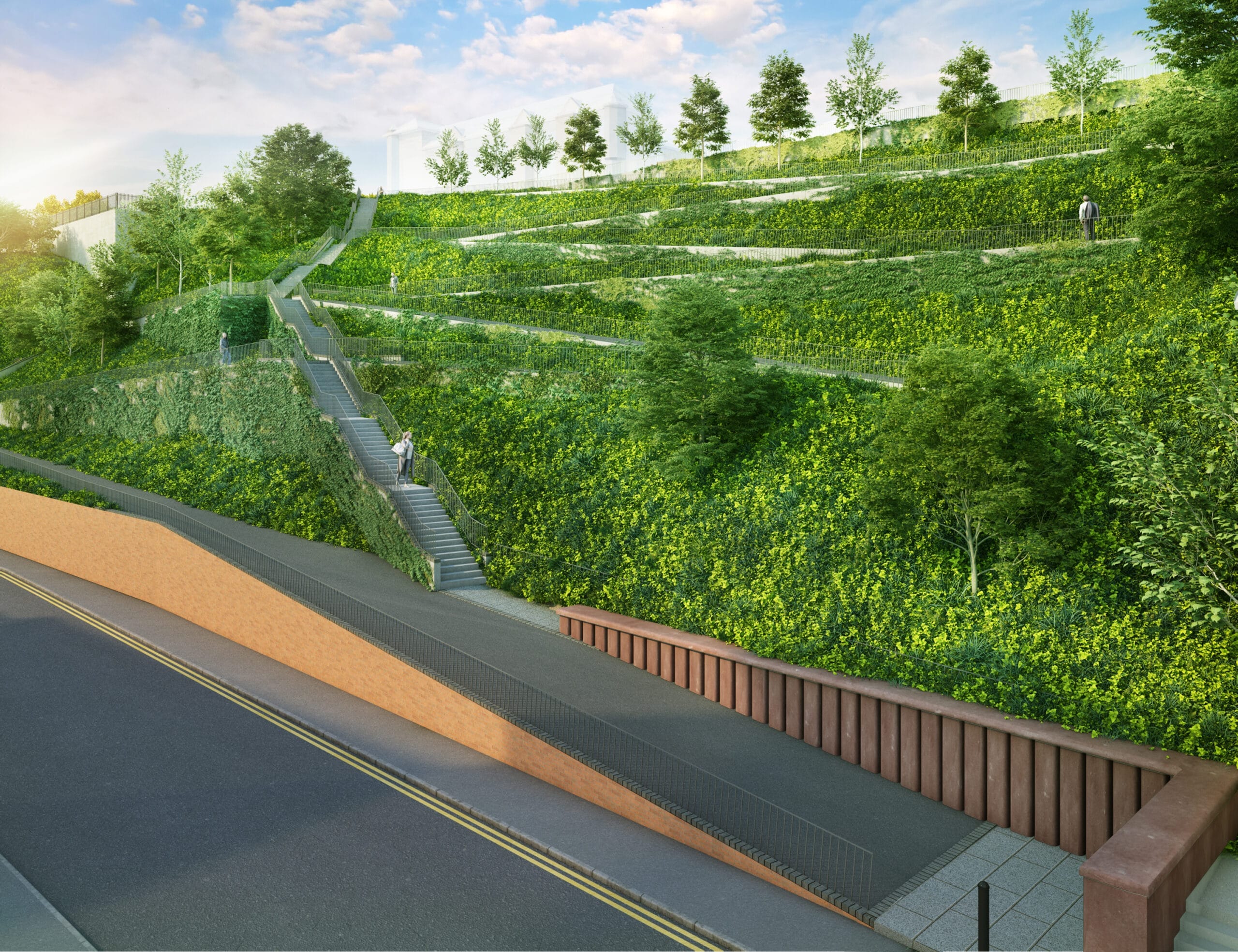 Prior to enabling work commencing in September 2022, the steeply sloping site was undeveloped and overgrown with dense vegetation and it was necessary to consider significant geotechnical challenges as part of design development, centring around; global and local slope stability, complex temporary works, risk of unexploded ordnance and restricted access.