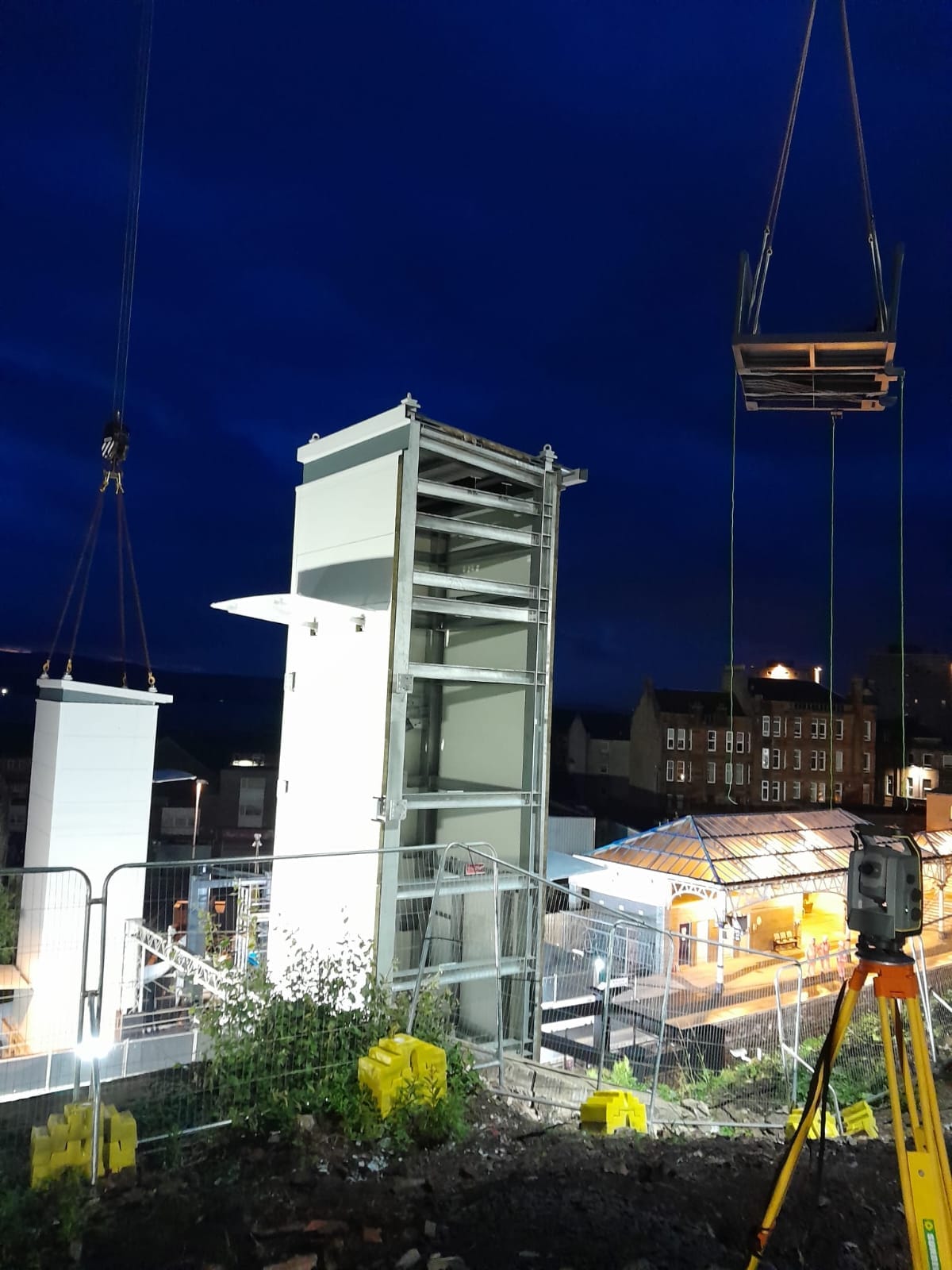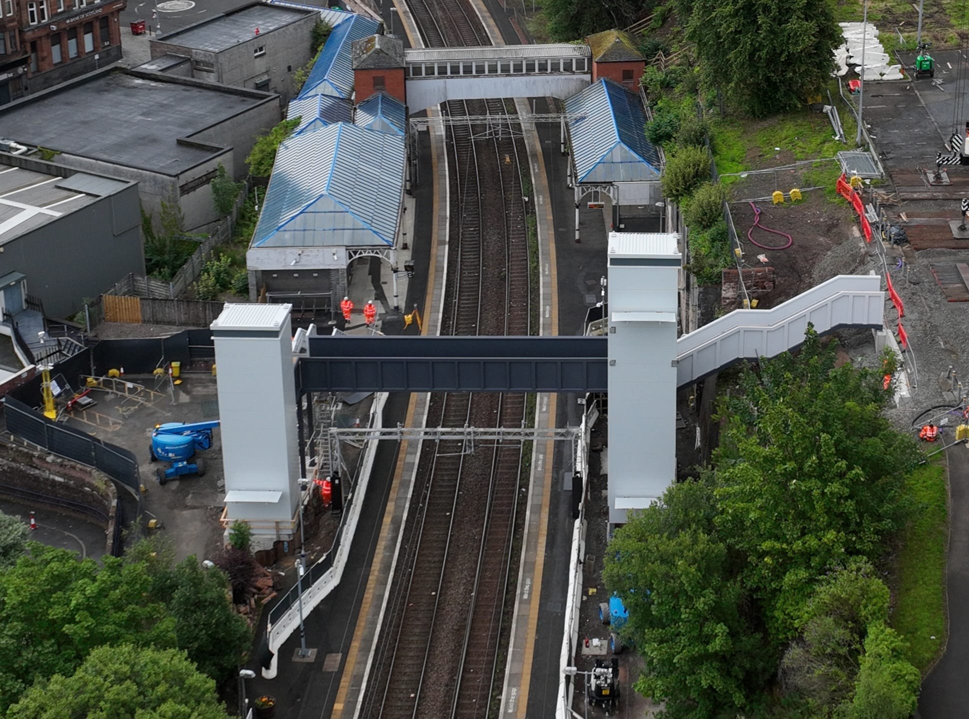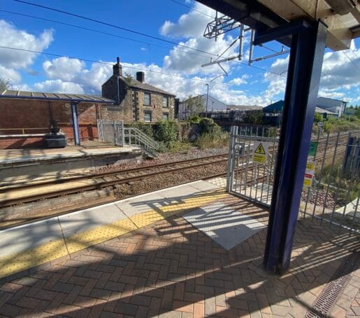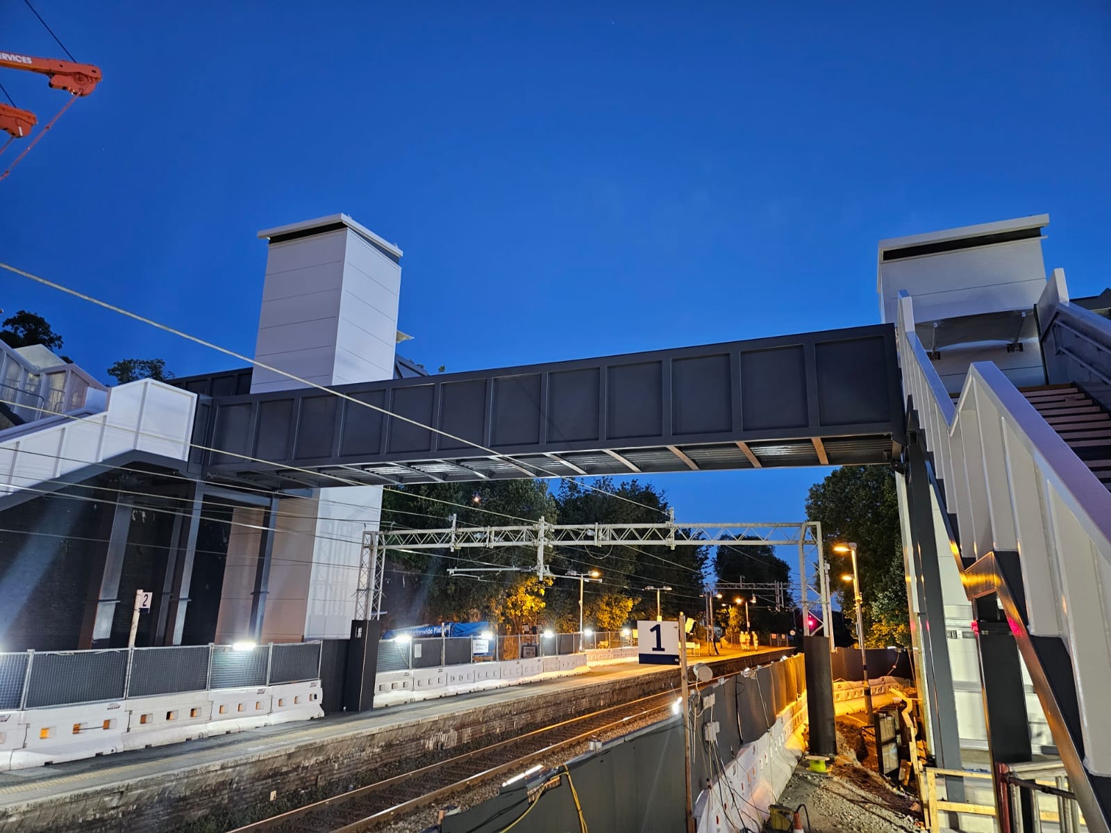 - A large steel footbridge structure with stairs and lifts. The project was unusual in that an additional level was required on one platform with a linkspan and stair structure to enable access to a park-and-ride station car park at a higher level
