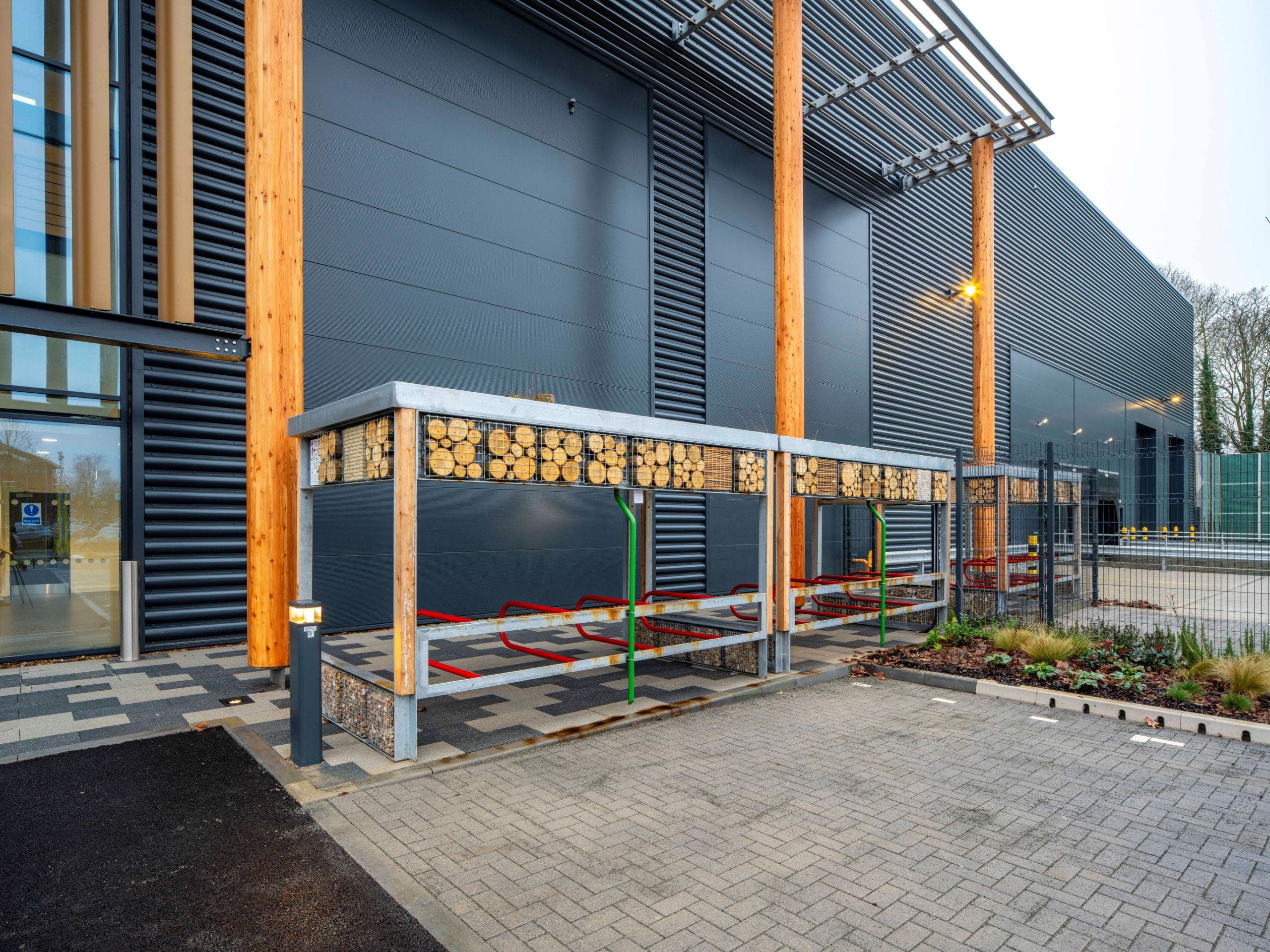 The client’s aspiration was for a building that stands out but also has strong sustainability credentials, evidenced by the extensive use of exterior grade timber for external columns and brise soleil, gabion basket cladding, green roofs to cycle shelter and bug hotels. The scheme achieved BREEAM Outstanding.