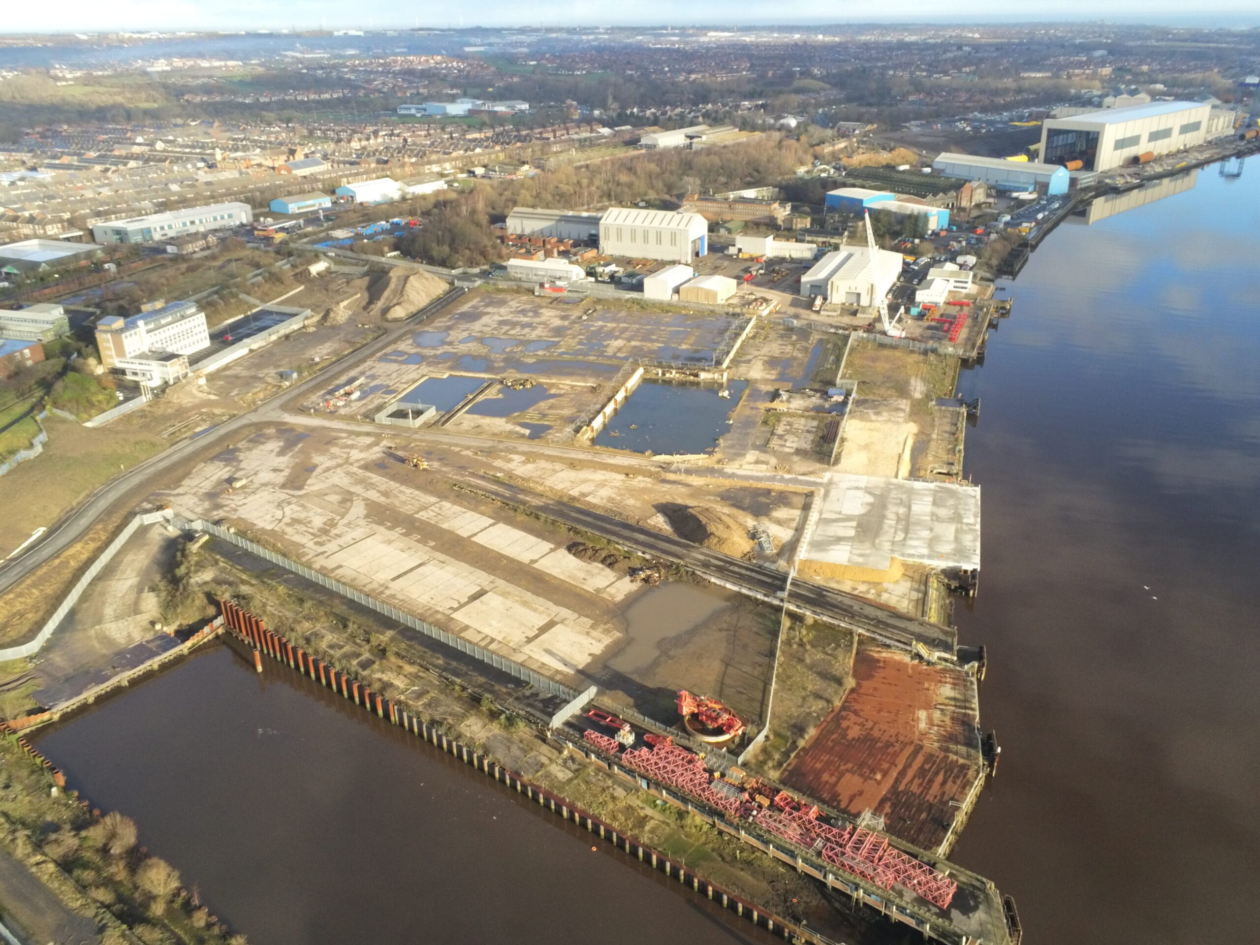 The site’s long historic operation as a shipbuilding, manufacturing, and subsequently decommissioning facility have provided some complications. A unique design of deck slab was required to suit the positioning of bearing piles in line with the existing constraints on site utilising tubular pile sizes already held in stock by the contractors supply chain which shortened the construction programme.