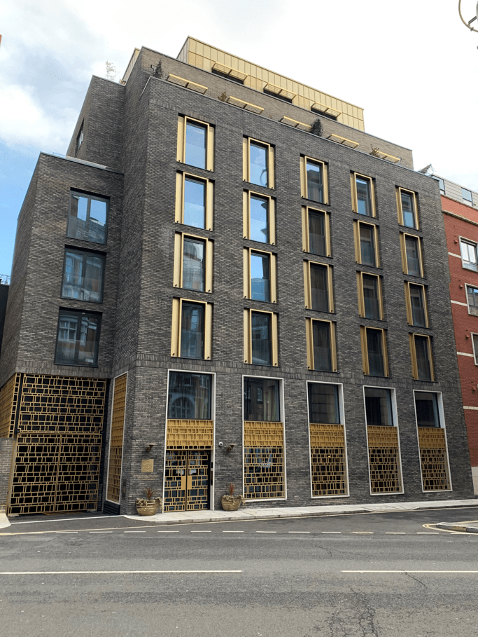 The external elevations are built from handmade imperial sized bricks to match the surrounding heritage buildings. The gold screens provide privacy to the hotel reception and bedrooms which also provide an interesting contrast with the dark brickwork.